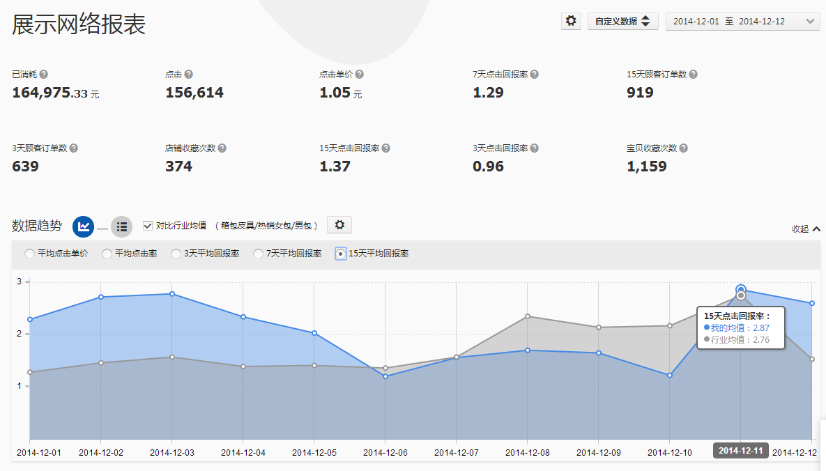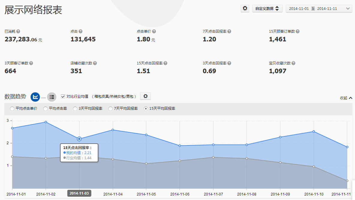 通過2014年雙11的曲線圖可以看到,從11月1日到11月11日,行業(yè)的平均ROI最高值出現(xiàn)在11月3日,只有1.44,而雙11當天的ROI只有0.35,是最低的一天,主要是因為點擊單價太高導致的,雙11當天行業(yè)的平均點擊單價為4.04元。