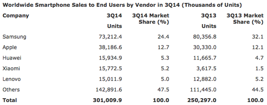 小米:小米首次出現(xiàn)在全球前五大智能手機廠商的榜單上。第三季度,小米在各大廠商中增長率最高。由于在中國市場表現(xiàn)強勁,并成為市場的領(lǐng)先者,小米第三季度的銷量同比增長率達到336%。