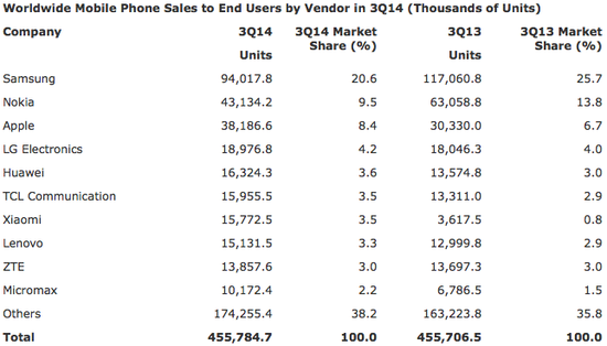 第三季度,面向全球終端用戶的手機銷量達到4.558億部,與2013年同期持平。拉美地區(qū)的手機銷量同比下降7.4%,西歐的手機銷量同比下降13.5%,日本的手機銷量同比下降1.8%。除此以外,其他地區(qū)的手機銷量均出現(xiàn)同比增長。