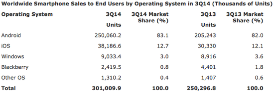 2014年第三季度世界智能手機銷量按操作系統(tǒng)排名