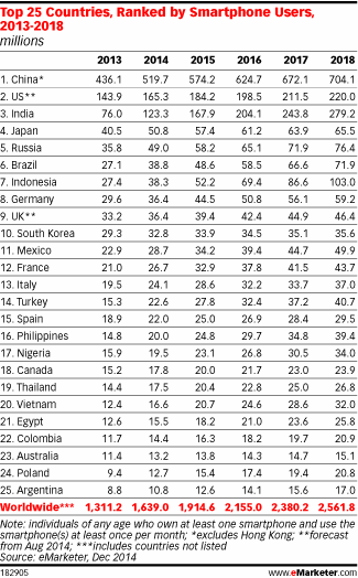 相比之下,美國當(dāng)前僅有1.653億智能機用戶(排名第二),而印度(排名第三)2013年的智能機用戶也只有7600萬(但是會在2018年增長到2.792億)。