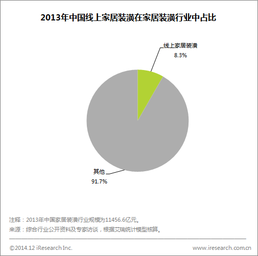 雖然過去幾年增長速度較快,線上家居裝潢市場在行業(yè)中的整體占比仍然不高,根據(jù)艾瑞咨詢統(tǒng)計(jì),2013年我國線上家居裝潢行業(yè)交易額規(guī)模在955.1億元,占行業(yè)整體規(guī)模比例為8.3%。