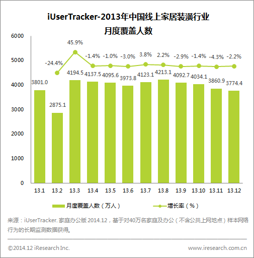 根據(jù)艾瑞iUserTracker數(shù)據(jù),2013年中國線上家居裝潢行業(yè)的月度覆蓋人數(shù)平均為3931.3萬人,總體波動(dòng)不大,其中2月份為低谷,可能與春節(jié)期間裝修活動(dòng)停滯有關(guān)。