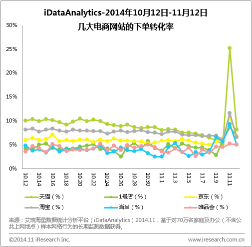 10月12日-11月12日期間,從幾大主流電商的下單轉(zhuǎn)化率可以看到:10月份天貓的轉(zhuǎn)化率普遍在9%-10%之間,但從10月末為“雙十一”蓄勢開始,用戶便開始積攢需求,等待“雙十一”當(dāng)天下單,天貓轉(zhuǎn)化率跌至9%以下,之后一路下滑,到11月10日,降到最低點(diǎn)5.1%。到11月11日,所有需求開始爆發(fā),轉(zhuǎn)化率驟增至25.1%,相當(dāng)于每四個訪問天貓的人中,就有一人下單。反觀淘寶、1號店、京東,則是“雙十一”前期呈小幅下降趨勢,大促當(dāng)天轉(zhuǎn)化率提升明顯,環(huán)比11月10日的增幅分別為91%、45%、74%。