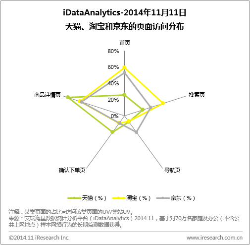 比較11月11日天貓、淘寶和京東訪客訪問各類頁面的覆蓋人數(shù)占比,可以看出三站訪客的訪問行為各有側(cè)重:天貓?jiān)L客對首頁和導(dǎo)航頁的訪問低于京東的53.2%和24.5%。由于淘寶與天貓的訪問互動,在淘寶搜索商品,可以搜到淘寶小商家和天貓店,所以三站之中,淘寶訪客對搜索功能的使用率最高,每兩人中就有一人訪問了搜索結(jié)果頁面,京東和天貓使用搜索的訪客在全站的占比則分別為1/3和1/4。然而,不管是導(dǎo)航還是搜索,電商網(wǎng)站最終都是希望訪客能進(jìn)入商品詳情頁并完成下單,這么說來,“雙十一”的最大贏家就是天貓,其73.6%的用戶會訪問商品詳情頁,淘寶和京東的這一比例則均在六成左右;相應(yīng)的,天貓的下單頁面訪客占比也高達(dá)全站的1/4,超過淘寶和天貓?jiān)撜急鹊膬杀队杏唷?/p>