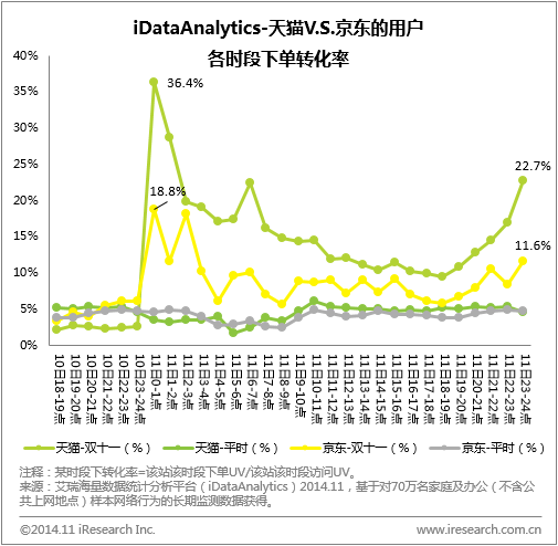 “雙十一”的熱鬧和酣戰(zhàn)過后,參與“血拼”讓利的各電商都收獲了相當(dāng)?shù)牧髁浚欢烤罐D(zhuǎn)化幾何,才是流量背后的真相。艾瑞咨詢iResearch基于網(wǎng)民連續(xù)用戶行為推出的海量數(shù)據(jù)分析服務(wù)iDataAnalytics-電商版,經(jīng)過深度挖掘數(shù)據(jù)顯示:2014年“雙十一”,天貓下單用戶占比超過25%,而0-2點(diǎn)的秒殺用戶轉(zhuǎn)化更佳。