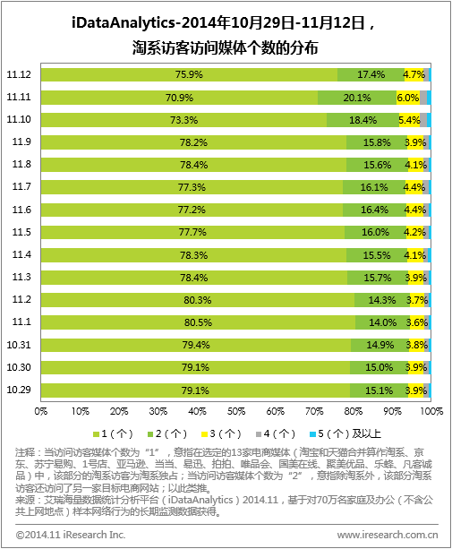 從近兩周淘系訪客訪問的電商平臺個數(shù)分布中可以看出:促銷前期,淘系的獨占訪客通常在78%-80%之間;而“雙十一”當天,由于相當比例的淘系訪客會同時在其他電商平臺上進行比價和產(chǎn)品挑選,淘系獨占比例降至70.9%;到了12號,這一比例又有所回升,達到75.9%。不難想見,“雙十一”如今作為一大促銷盛世,越來越多的電商站點參與其中,有一定的訪客分流實屬正常。但盡管如此,天貓和淘寶龍頭老大的地位仍是不可撼動。