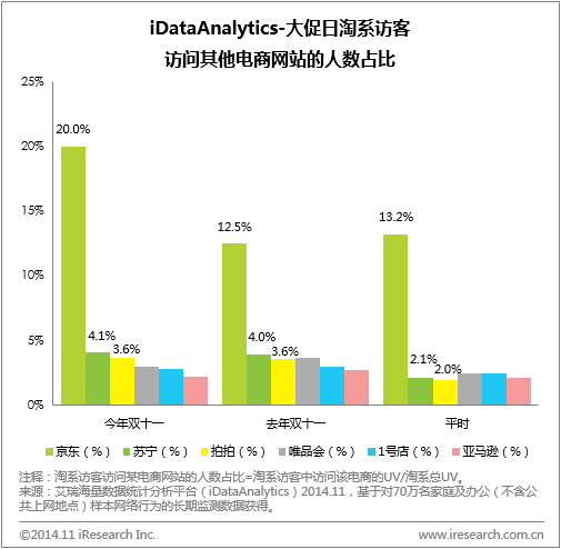 今年的“雙十一”已圓滿落幕,阿里的高銷量、高流量和高轉(zhuǎn)化已注定其贏家地位。然而在這些耀眼的數(shù)據(jù)背后,網(wǎng)購用戶在淘寶和天貓的訪問行為究竟是怎樣的?艾瑞咨詢iResearch基于網(wǎng)民連續(xù)用戶行為推出的海量數(shù)據(jù)分析服務iDataAnalytics-電商版,經(jīng)過深度挖掘數(shù)據(jù)顯示:2014年“雙十一”當天,淘系訪客中,在多電商平臺間切換訪問的人數(shù)占比明顯高于往日,尤以與京東的重合人數(shù)增加最為明顯;0點-2點之間,網(wǎng)購用戶單頁瀏覽時間最短,人均瀏覽頁面最多。