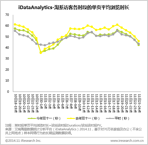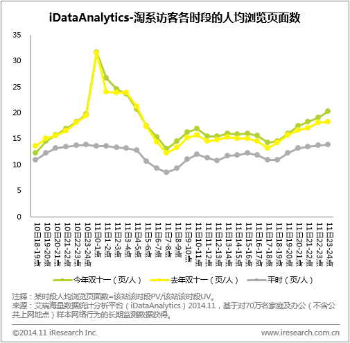 “雙十一”當天,淘系訪客各時段的人均訪問頁面數(shù)和單頁平均瀏覽時長較平時都出現(xiàn)了明顯的變化:11日0點-1點,淘系的人均訪問頁面數(shù)達到峰值31.7頁/人,是平時同時段的2.3倍,單頁平均瀏覽35.8秒,而平時為42.9秒。艾瑞分析認為:11日0點伊始的淘系用戶的購買意愿最為強烈,相當一部分在前期推廣期間即完成了預購商品的選定和收藏,只等時間一到,立刻動手,也因此其在商品頁面停留的時間相對較短。從年度變化看,各時段的人均訪問頁面數(shù)與去年“雙十一”大體持平,所謂“時間變了,搶法不變”。
