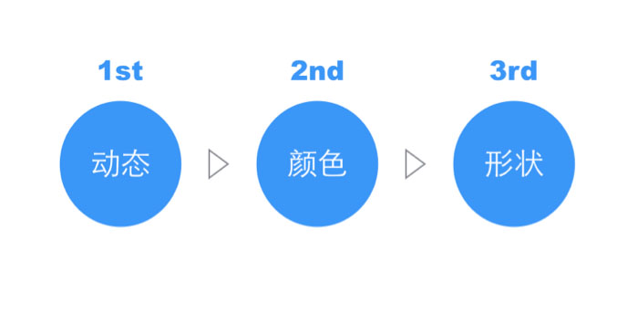 從看到一個(gè)頁(yè)面的瞬間開(kāi)始,如果在展示面積相同的情況下,用戶的注意力會(huì)按照一個(gè)特定的順序依次被吸引:動(dòng)態(tài)>顏色>形狀。