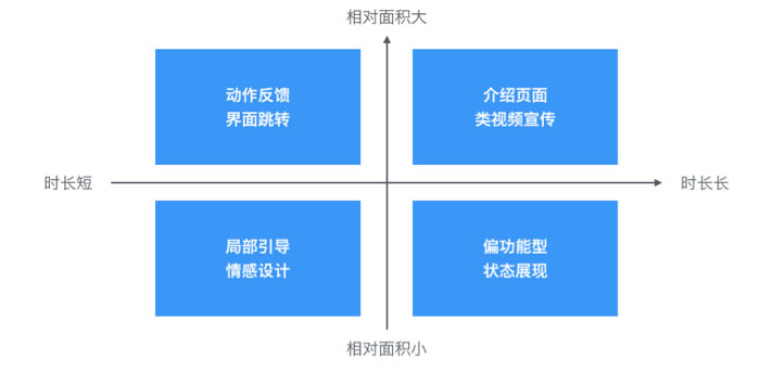 一個(gè)動(dòng)效對(duì)于用戶的注意力吸引有多強(qiáng),可以分為兩個(gè)核心維度,動(dòng)效的展現(xiàn)面積與持續(xù)時(shí)間。展現(xiàn)面積越大,動(dòng)效持續(xù)時(shí)間越長(zhǎng)(包括單一動(dòng)效與復(fù)合動(dòng)效),用戶注意力越能夠被吸引并持續(xù)。將兩個(gè)核心維度構(gòu)成一個(gè)二維圖表,形成的四個(gè)象限可以代表四類不同的動(dòng)效: