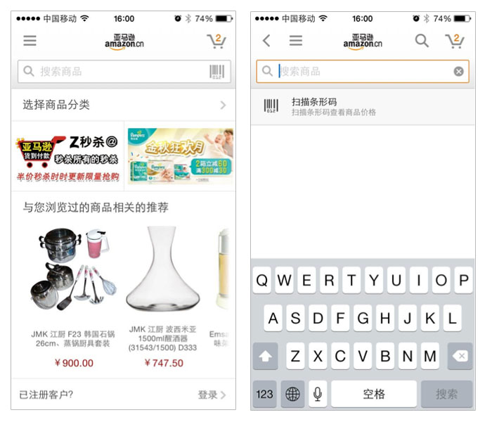 亞馬遜客戶端點(diǎn)擊搜索后,菜單按鈕會(huì)向右移動(dòng),返回按鈕隨之進(jìn)入。這里的動(dòng)效稍微提示了一下“返回”的出現(xiàn),同時(shí)又沒(méi)有搶走用戶對(duì)搜索的注意力,恰到好處。
