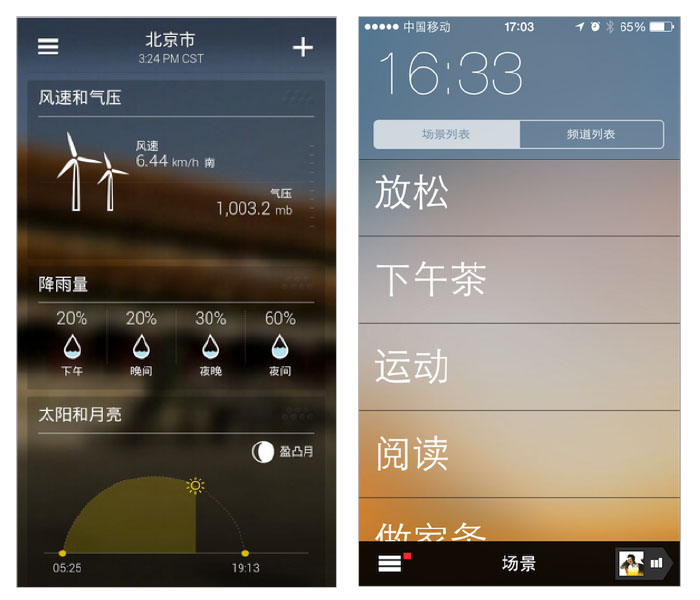 雅虎天氣中的風(fēng)車轉(zhuǎn)動(dòng),美樂(lè)時(shí)光的動(dòng)態(tài)按鈕,都是體現(xiàn)了產(chǎn)品功能或狀態(tài),這樣的動(dòng)效雖然一直持續(xù)的吸引注意,但是由于面積較小,所以并不會(huì)對(duì)其他功能使用產(chǎn)生過(guò)多干擾。動(dòng)效的展現(xiàn)面積會(huì)非常需要好好斟酌。