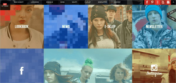 Cropp 具有大膽張狂的個(gè)性,正如其布局所展現(xiàn)。鼠標(biāo)懸停在任意圖片上時(shí),圖片會(huì)像素畫并變得難以識(shí)別,從而牢牢抓住人的注意力。頂部的導(dǎo)航欄在所有頁(yè)面均保持一致,而主頁(yè)則基本上就是導(dǎo)航欄中各個(gè)選項(xiàng)的高調(diào)視覺呈現(xiàn)。這個(gè)網(wǎng)站的布局牢牢抓住了像素化這一創(chuàng)意,其所有照片和視頻都以方塊形式安置,很像是經(jīng)過像素化后的圖片。