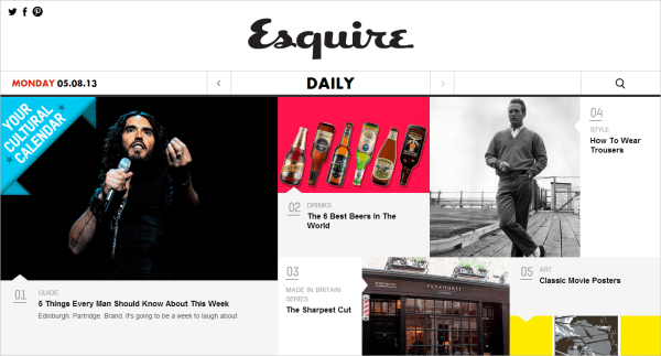 這個(gè)網(wǎng)站的布局簡(jiǎn)單、清爽、易于理解。Esquire的大標(biāo)題就是單調(diào)的黑與白。其文章導(dǎo)讀使用彩色,能夠吸引讀者眼球。懸停特效也很簡(jiǎn)單,在導(dǎo)讀標(biāo)題下方有說明內(nèi)容。導(dǎo)航欄位于網(wǎng)站中間位置,功能上很類似報(bào)紙通過折頁(yè)位置上方的內(nèi)容引起讀者的興趣。其圖像、顏色和簡(jiǎn)介標(biāo)題也很能吸引用戶注意。