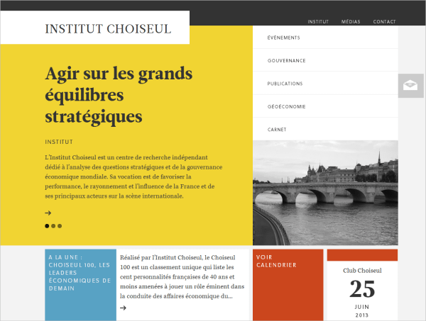 Intitut Choiseul 采用了很有趣的塊狀布局,彼此之間就像拼圖一樣契合。層疊式外觀以及色塊能夠有效確立風(fēng)格。繼續(xù)向頁(yè)面下方滾動(dòng),其布局轉(zhuǎn)換成比較傳統(tǒng)的網(wǎng)格形式,但其實(shí)每個(gè)故事都位于一個(gè)大小各不相同的塊內(nèi),營(yíng)造出一種有趣而動(dòng)態(tài)的美感。不同的色塊標(biāo)志著網(wǎng)站的不同內(nèi)容,因此比較方便導(dǎo)航和閱讀。這家網(wǎng)站從質(zhì)量上說比較精良,和自身設(shè)立目的相符。