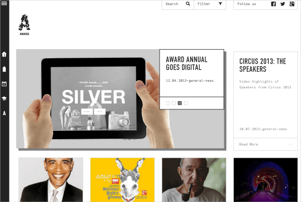 Award 崇尚創(chuàng)意,其中性的設(shè)計(jì)美學(xué)為設(shè)計(jì)師的作品搭建起了有效的展現(xiàn)平臺(tái)。網(wǎng)格化布局沒有任何會(huì)轉(zhuǎn)移人注意力或產(chǎn)生沖突的邊邊角角,一切以設(shè)計(jì)師為主角。但其有趣的懸停效果采用了不錯(cuò)的像素化投射陰影。導(dǎo)航欄固定在頁(yè)面左側(cè),搜索和篩選功能固定在頂部。這一導(dǎo)航布局非常適合于展示網(wǎng)站內(nèi)容。
