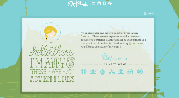 Abby Putinski采用了原創(chuàng)的方式表現(xiàn)自己的作品集網(wǎng)站,從而彰顯出了自己作為一名創(chuàng)意插畫家和圖形設(shè)計(jì)師的獨(dú)特性。在加載時(shí),屏幕上會(huì)顯示一個(gè)具有動(dòng)畫效果的介紹窗口邀請(qǐng)用戶深入探索她的作品。在關(guān)閉這個(gè)窗口后,可以看到一個(gè)匯集了她各次旅程的地圖。這個(gè)網(wǎng)站實(shí)際上并沒有嚴(yán)格意義上的布局,它不存在明確的界限,非常自由開放,因此導(dǎo)航體驗(yàn)異常有趣。用戶隨意點(diǎn)擊一幅作品時(shí),類似明信片框架內(nèi)的圖片就會(huì)落入頁(yè)面,進(jìn)而開始循環(huán)介紹有關(guān)旅途的創(chuàng)意。導(dǎo)航欄固定在頂部,可以隨時(shí)使用。