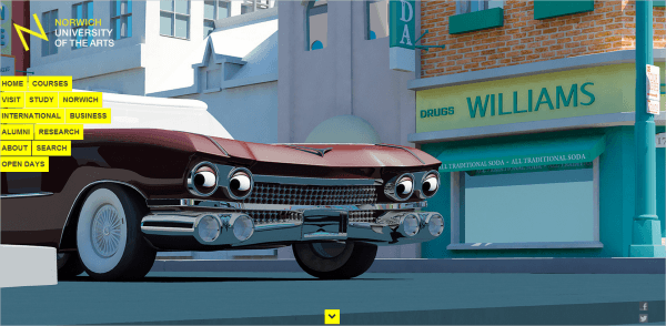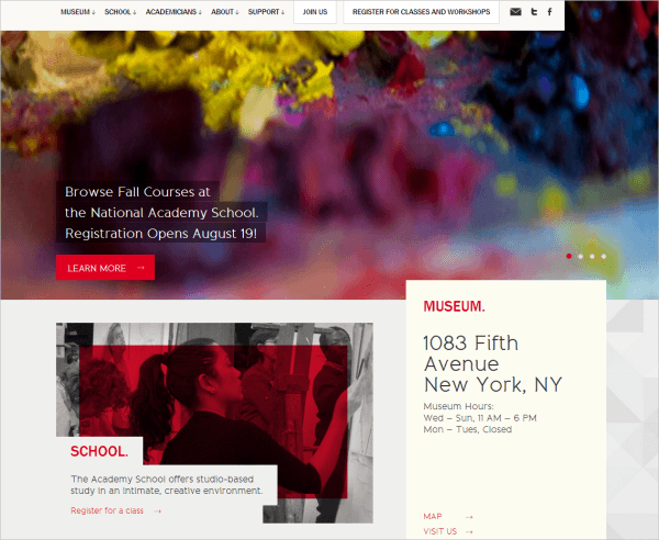 具有沖擊力的照片和美輪美奐的圖片充分展示了這所高校的藝術(shù)特質(zhì)。主頁(yè)的背景圖片展開了一個(gè)生動(dòng)有趣的故事,可以吸引用戶。其導(dǎo)航欄放到側(cè)面的布局很不錯(cuò),與眾不同而且完全有效,同時(shí)也不會(huì)搶圖片和布局的風(fēng)頭。網(wǎng)站所有標(biāo)簽均為黃色,能夠形成貫穿始終的一致化視覺特色。點(diǎn)擊任意內(nèi)容分類后,下拉菜單將吸引人的注意力,同時(shí)與布局相得益彰。