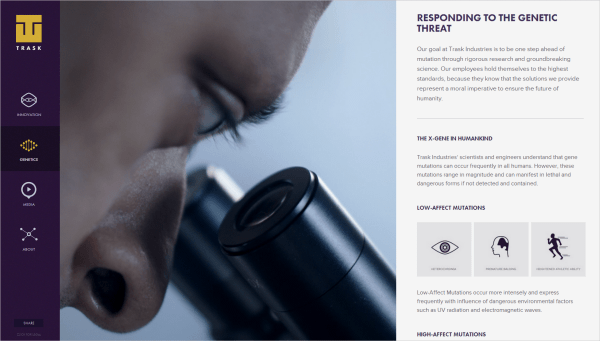 Trask Industries 是X戰(zhàn)警新片的宣傳網(wǎng)站。網(wǎng)站布局簡(jiǎn)單有效,可分為三大部分,導(dǎo)航側(cè)邊欄固定于左側(cè),中央為視頻區(qū),主要內(nèi)容在右側(cè)垂直顯示。這里所使用的視頻能夠有效地激發(fā)人們對(duì)這部電影的期待感。導(dǎo)航圖標(biāo)的動(dòng)畫懸停效果也很不錯(cuò)。這個(gè)網(wǎng)站的核心就是干凈簡(jiǎn)潔,正如其以視頻作為主角這一做法所示。過渡效果比較俏皮,內(nèi)容區(qū)會(huì)滑出滑入。另外,你還可以嘗試縮放一下瀏覽器看看布局變化的效果——縮小時(shí)導(dǎo)航欄會(huì)隱藏,但鼠標(biāo)滾動(dòng)時(shí)內(nèi)容仍然可見。