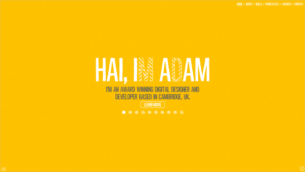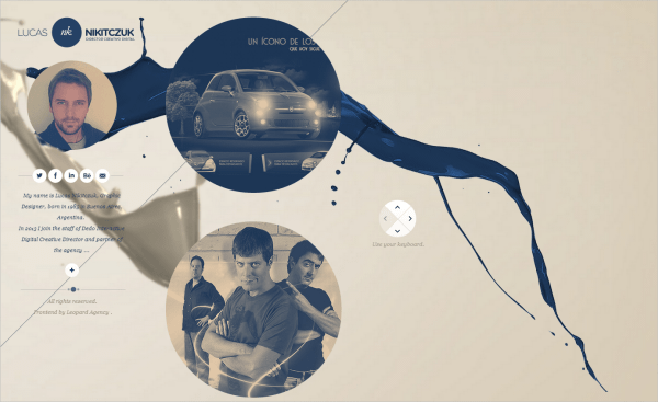 我個(gè)人非常喜歡Lucas Nikitczuk作品集的布局,原因就在于其表現(xiàn)出了Lucas的水平。網(wǎng)站開門見山,主頁(yè)是設(shè)計(jì)師的簡(jiǎn)短自傳以及作品。圓圈圖形帶來了友好和流程的美感。背景上潑濺的油漆奠定了網(wǎng)站的開放和自由特色。導(dǎo)航欄簡(jiǎn)單好用,在整個(gè)網(wǎng)站內(nèi)保持一致。另一個(gè)值得稱道的地方是,用戶可以使用方向鍵進(jìn)行導(dǎo)航,這一點(diǎn)對(duì)于筆記本用戶來說非常方便。