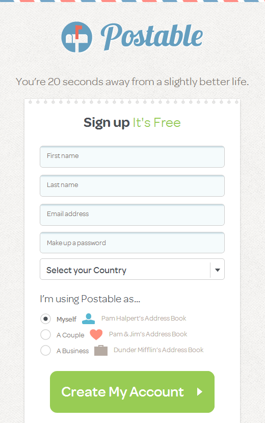 Postable 的理念非??蓯郏黄鋾?huì)通過郵件給用戶發(fā)送設(shè)計(jì)精良的感謝卡,另一方面網(wǎng)站的設(shè)計(jì)外觀類似于郵政郵遞的感覺。網(wǎng)站的整體設(shè)計(jì)和布局在傳達(dá)網(wǎng)站理念方面扮演了至關(guān)重要的角色。網(wǎng)站背景采用了紙張材質(zhì),頂部邊緣類似老式的信封。將真實(shí)生活中的感覺放到Web上能夠帶來非常令人舒適的韻味,就好像你真的在筆記本上書寫一般。