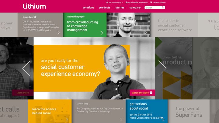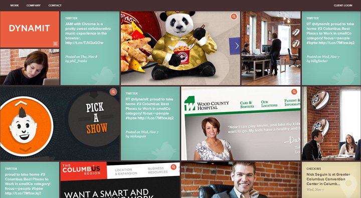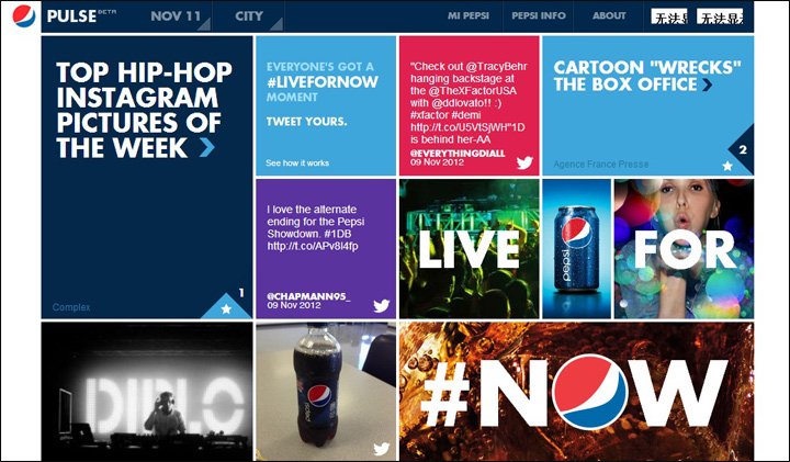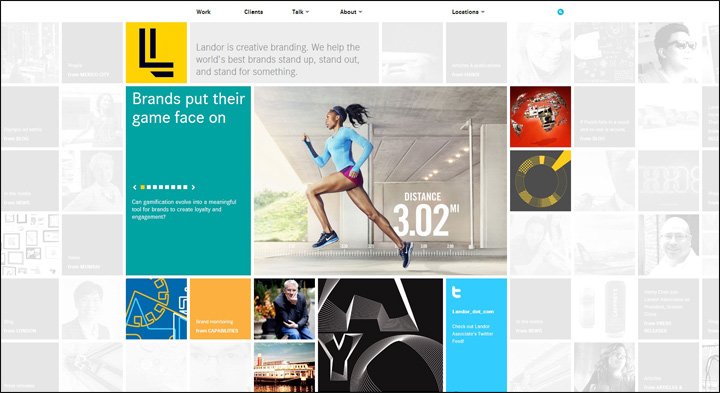 這一設(shè)計(jì)方法主要是引入了方塊的網(wǎng)格設(shè)計(jì),這些方塊要嘛是純色塊配上文字,要嘛是方形照片配上文字。"簡(jiǎn)潔"是吸引用戶的一大原因,而不同的色塊放在一起形成強(qiáng)烈的對(duì)比,容易引起用戶的視覺興趣,進(jìn)而繼續(xù)探索下去。