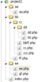 看我們的實(shí)驗(yàn)圖,在圖中項(xiàng)目下分別有aa bb ee 三個(gè)同級(jí)目錄和一個(gè)index.php文件,在bb下又有cc目錄,cc下又有dd目錄和cc.php ccc.php兩個(gè)文件,同樣dd下也包含一個(gè)dd.php文件。凡是上層對(duì)下層均屬上級(jí)引用.