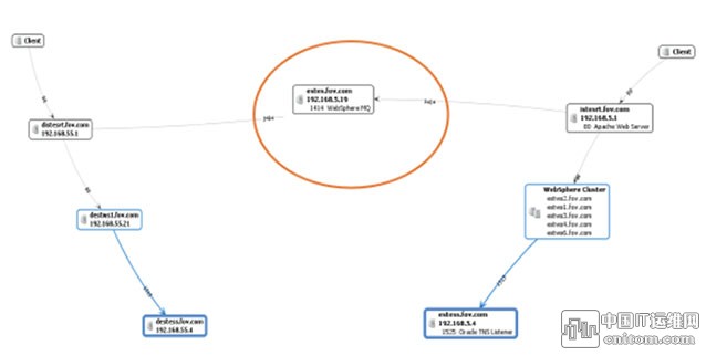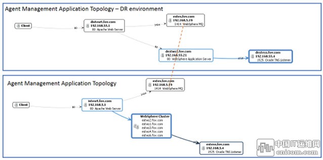 這里是一個(gè)實(shí)際的案例,展示的是同一個(gè)業(yè)務(wù)應(yīng)用的兩幅業(yè)務(wù)邏輯圖,它們是由VNT的IlluminIT系統(tǒng)自動(dòng)發(fā)現(xiàn)的。上面的一幅是災(zāi)備系統(tǒng)里的環(huán)境,下面的一幅是生產(chǎn)系統(tǒng)的環(huán)境。