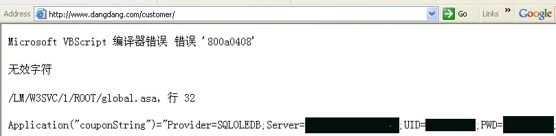 第三個(gè),”當(dāng)當(dāng)當(dāng)”, 當(dāng)當(dāng)網(wǎng)的數(shù)據(jù)庫(kù)賬戶泄漏事件。程序出錯(cuò)頁(yè)面居然把數(shù)據(jù)庫(kù)連接串和密碼什么的都打印出來(lái)了。不得不佩服一下。