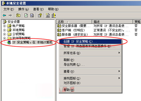 第二步:點(diǎn)“IP安全策略,在本地計(jì)算機(jī)”,然后在右欄空白處點(diǎn)右鍵,在彈出的菜單中點(diǎn)“創(chuàng)建IP安全策略(C)”如圖: