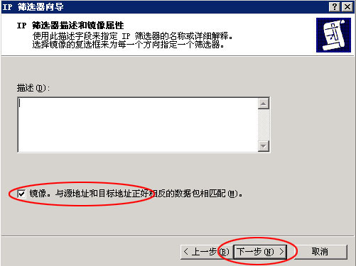 第十六步:在IP篩選器描述和鏡像屬性中輸入描述并選中鏡像。然后點(diǎn)下一步