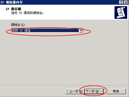 第十七步:在IP通信源中的源地址選擇“我的IP地址”,并點(diǎn)下一步