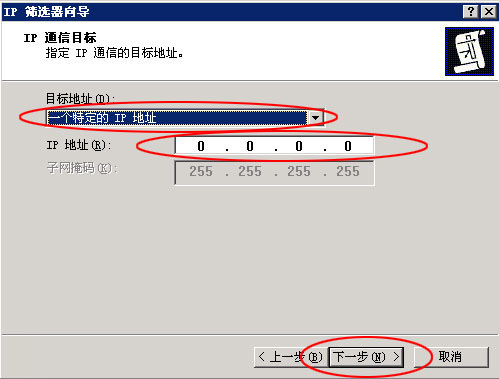 第十八步:在IP通信目標(biāo)的目標(biāo)地址中選擇“一個(gè)特定的IP地址”,把IP地址填寫為你要限制的IP,如192.168.0.199,然后點(diǎn)下一步