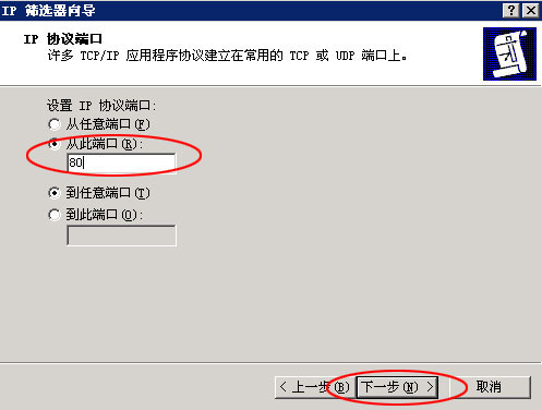 第二十步:在IP協(xié)議端口選擇從此端口,并填上你要限制的端口,如80,然后點(diǎn)下一步