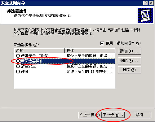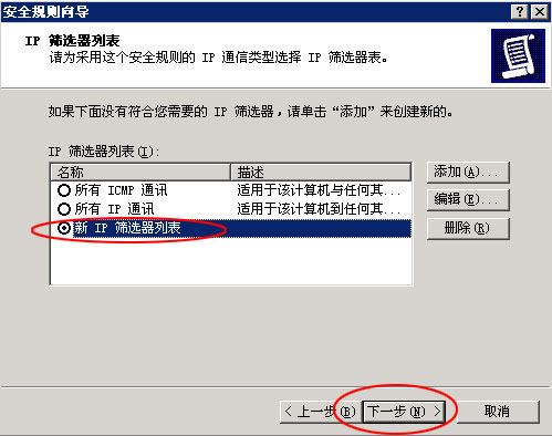 第二十二步:在IP篩選器列表點(diǎn)確定,然后選中“新IP篩選器列表”(剛才創(chuàng)建的),點(diǎn)下一步