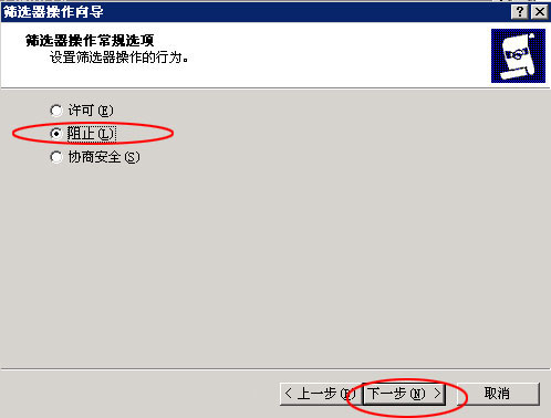 第二十五步:在設(shè)置篩選器操作的行為中選擇“阻止(L)”,然后點(diǎn)下一步