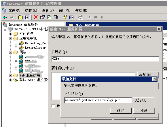 2. 新增一個服務(wù)擴(kuò)展,路徑為 "%windir%\System32\inetsrv\gzip.dll"。添加完成后,允許該擴(kuò)展使用。