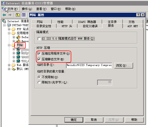 1. 在 "IIS 管理器" 中,打開 "網(wǎng)站 >屬性" 對話框,切換到 "服務(wù)" 頁卡,選中兩個壓縮選項。