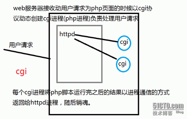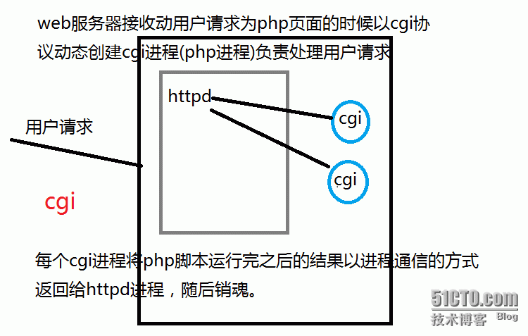 CGI,這種方式把php直接編譯成httpd的模塊,每個(gè)httpd請(qǐng)求進(jìn)程對(duì)應(yīng)一個(gè)php(cgi)進(jìn)程,httpd動(dòng)態(tài)創(chuàng)建進(jìn)程需要時(shí)間,并且額外的進(jìn)程會(huì)占用資源開(kāi)銷(xiāo),進(jìn)程間通信的結(jié)果返回httpd進(jìn)程,httpd負(fù)責(zé)銷(xiāo)毀進(jìn)程。由httpd負(fù)責(zé)子進(jìn)程的創(chuàng)建和回收。