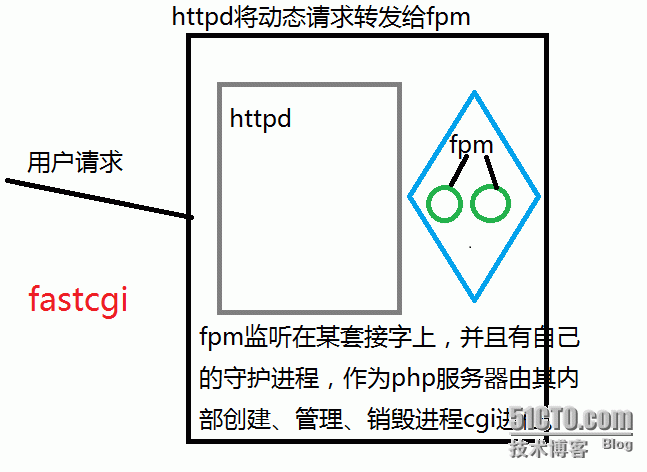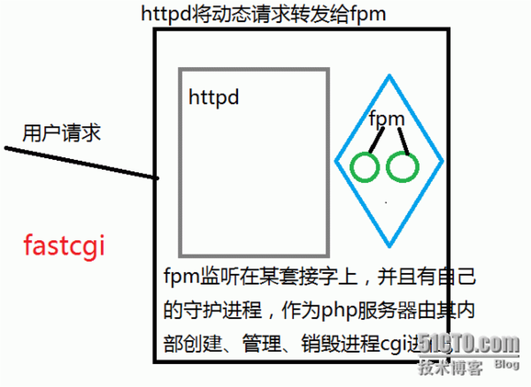 fastcgi(httpd作為客戶端想php服務(wù)器發(fā)起請(qǐng)求,php服務(wù)器內(nèi)部管理和銷(xiāo)毀進(jìn)程)fpm,監(jiān)聽(tīng)在一個(gè)套接字上,Daemon進(jìn)程。
